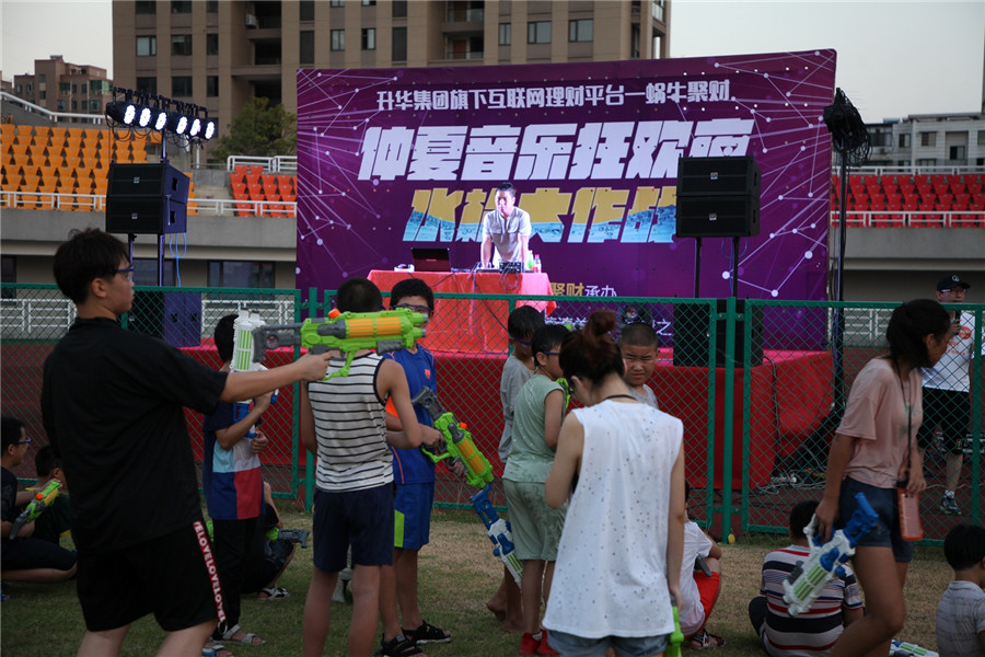7月29日傍晚7點(diǎn)多,德清體育中心足球館內(nèi)不見足球橫飛,卻見水花四濺,集團(tuán)所屬企業(yè)升華金融“蝸牛聚財(cái)”平臺(tái)上線一周年慶?;顒?dòng)之一的水槍大戰(zhàn)在這里激情上演。翌日,該公司又舉辦了一場(chǎng)親子活動(dòng)。 ▲仲夏夜之水槍大戰(zhàn) ▲小伙,挺?。 朗裁唇懈贡呈軘沉税?!▲看我水…