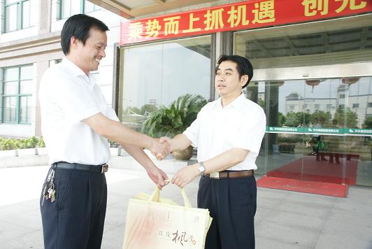 圖為鮑希楠在為2004屆公司勞模湯建方送上慰問(wèn)品時(shí)的合影。